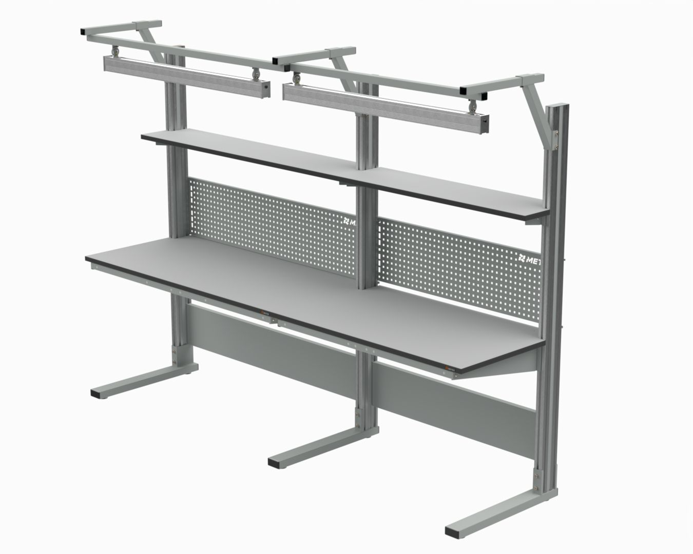 В комплект входят стол серии 41.С, верхняя полка шириной 300 мм, перфорированный экран, комплект для крепления освещения и светодиодная лампа.